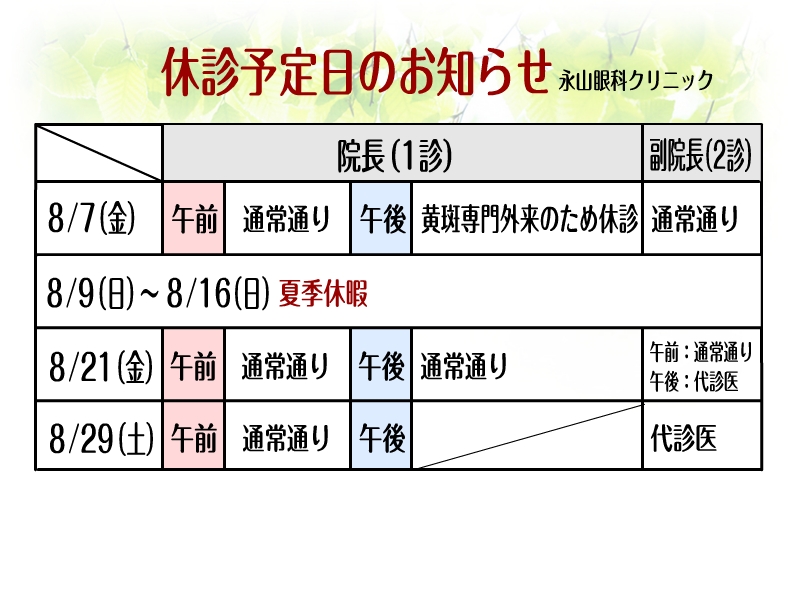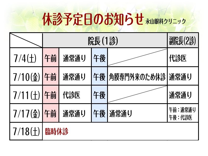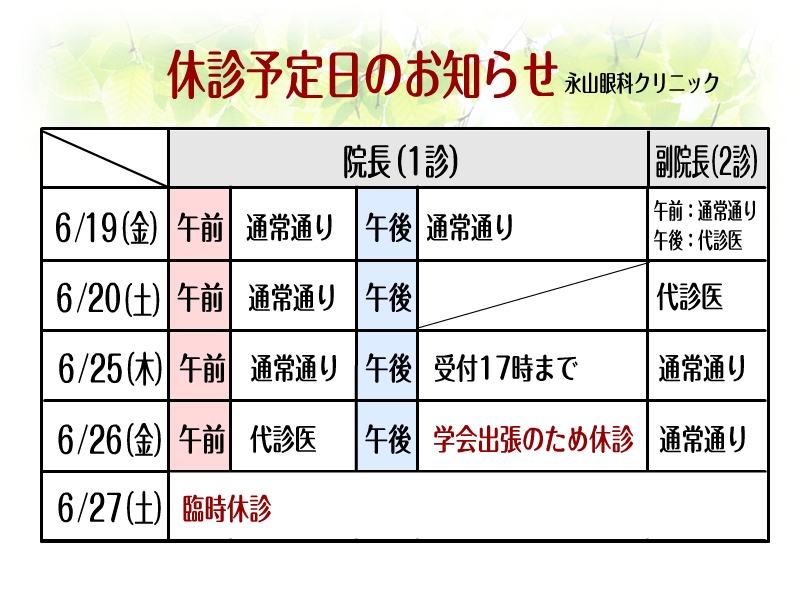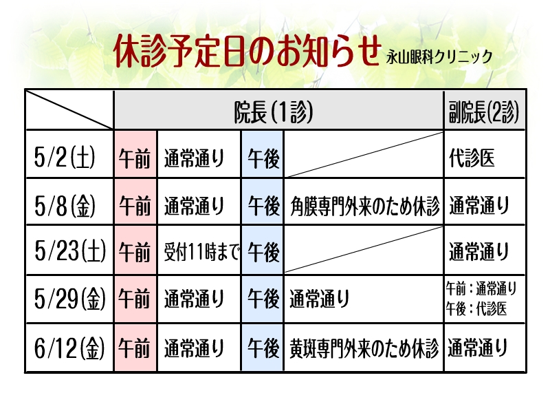 休診予定日を更新いたしました。 2026 4/24 2023年6月25日2026年4月24日 よかったらシェアしてね! URLをコピーしました! URLをコピーしました! 専門外来予定を更新いたしました。 関連記事 MyNavi Clinic記事(ドライアイ診療) 2025年9月27日 ドクターズファイル記事 2025年9月27日 クーパービジョン社製品のコンタクトレンズをお使いの方へ 2025年6月3日 一部点眼薬の生産、供給について 2024年7月9日 施設基準のお知らせ 2024年6月8日 ワンタッチコールを導入いたしました 2023年8月28日 マイナンバーカードによる資格確認につきまして。 2023年7月26日 近視予防管理に最適な「マイオピア・マスター®」を導入いたしました。 2023年7月26日